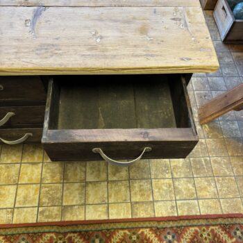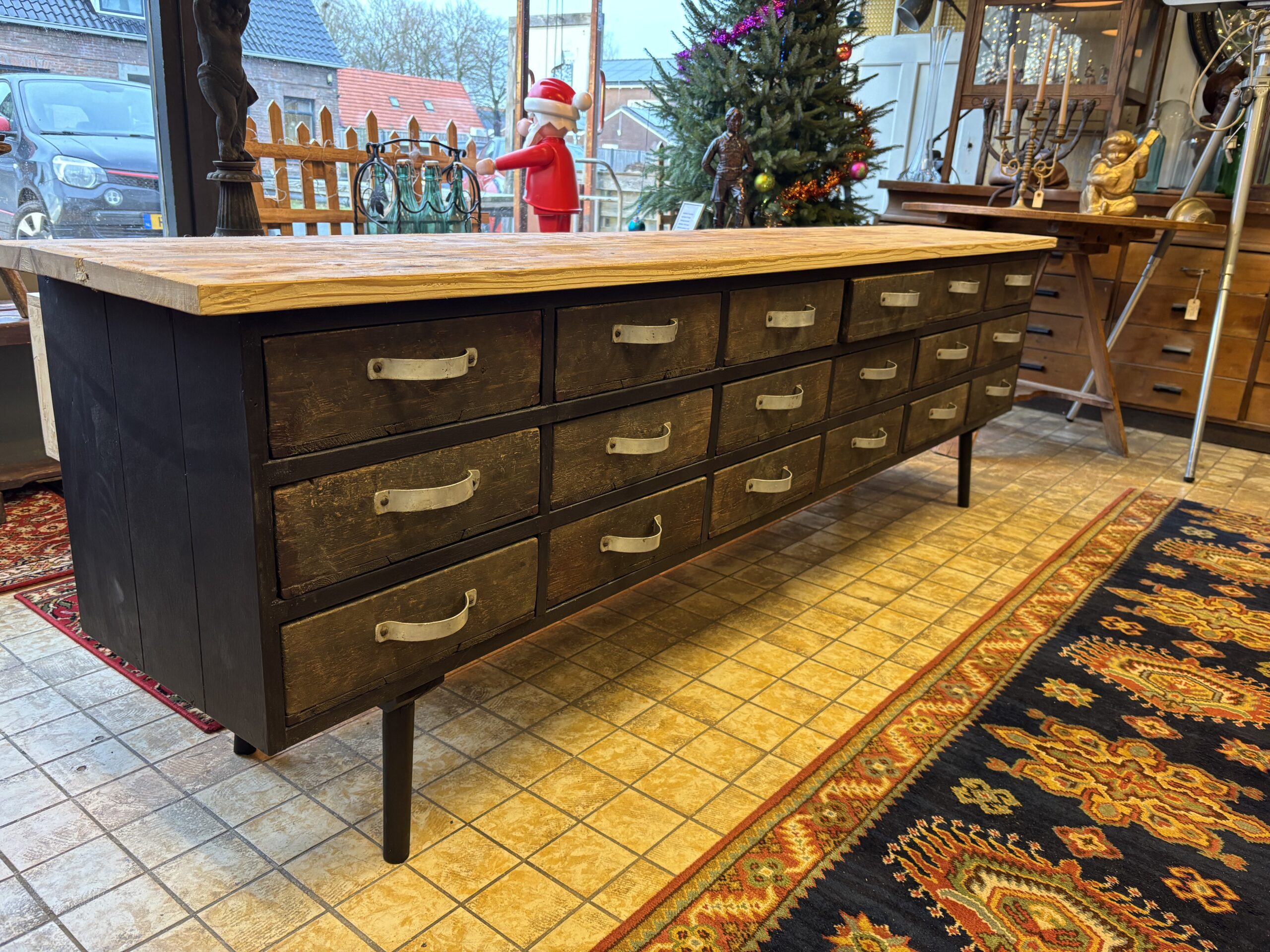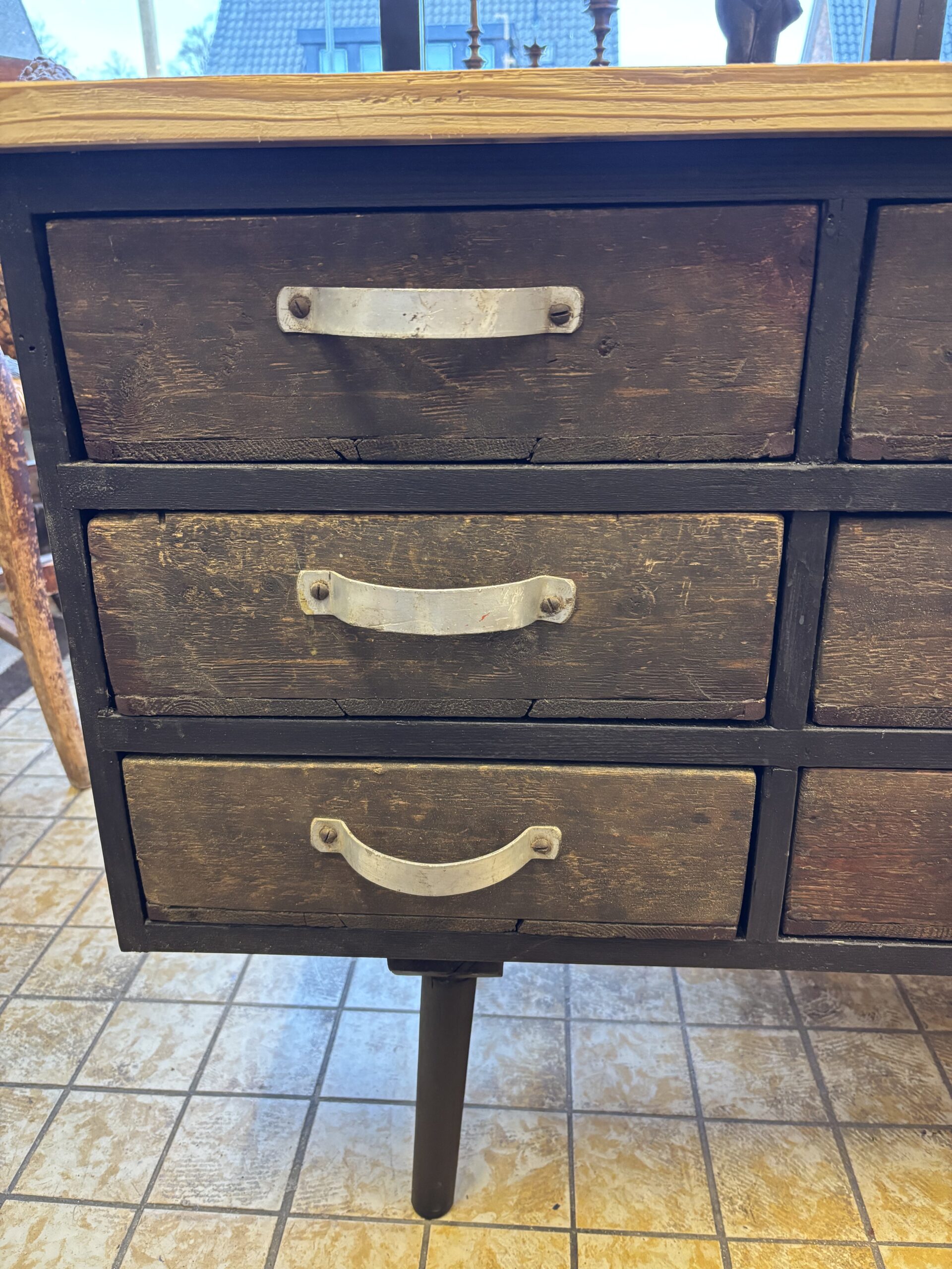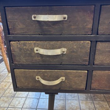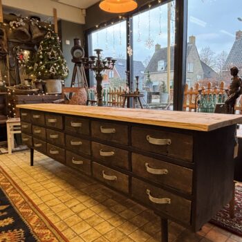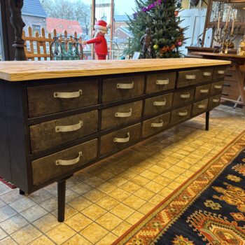 Tv-kast/side table. Met 12 lades uit een apothekerskast. Alle lades zijn verdeeld in vakjes, maar de vakjes kunnen er ook uit. De kast heeft veel bergruimte. Volledig gemaakt uit gerecycled materiaal (upcycling, 100% groen).